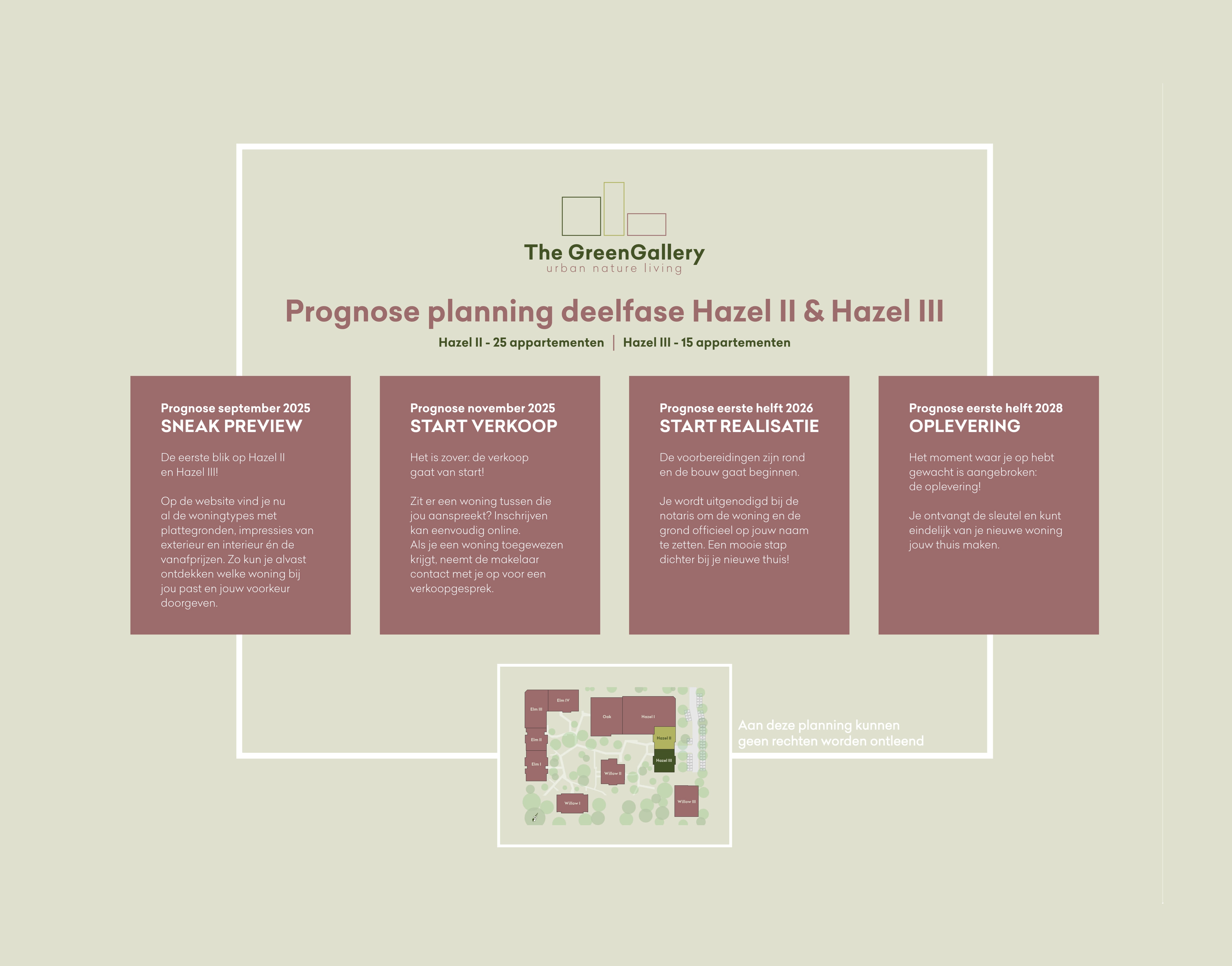 Met de start van Hazel II en III komt de droom van wonen in The Green Gallery weer een stap dichterbij. Hieronder zie je een prognose van de planning rondom Hazel!